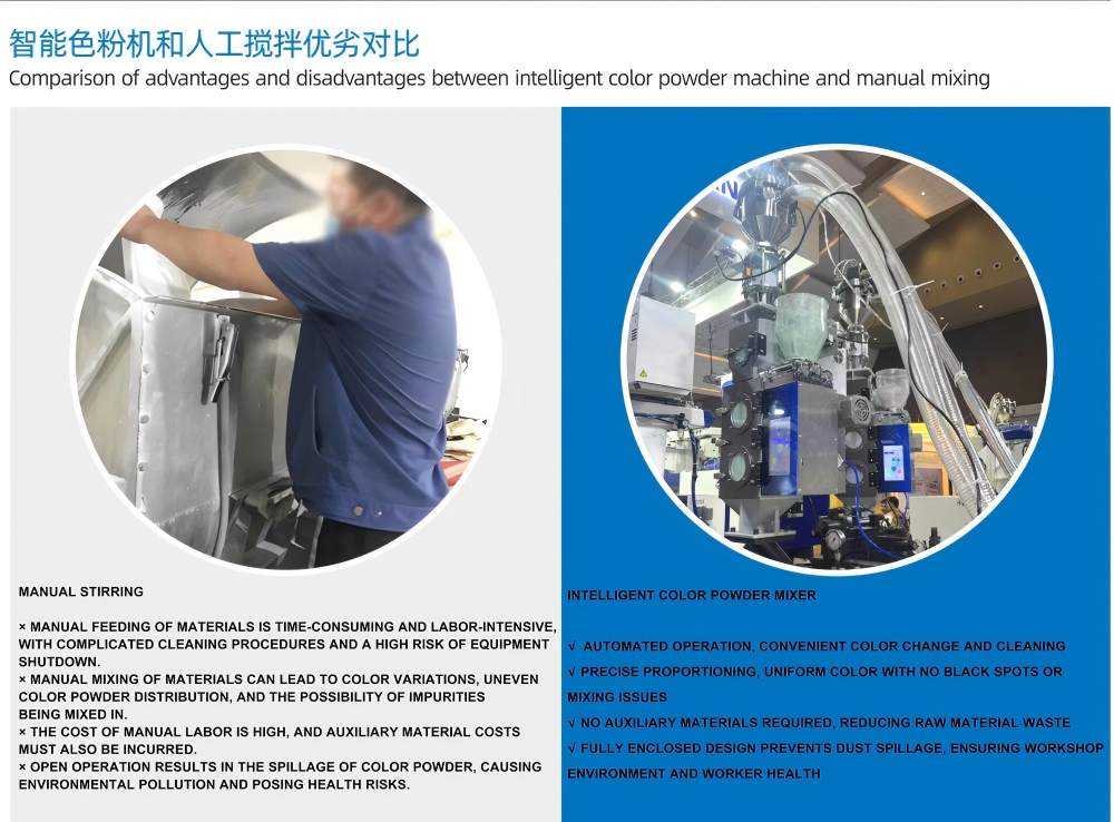 100KG/H"Intelligens Color pulveris Mixtionis" inconsutilis integrari potest cum systematis pascendi centralised, systematibus centralibus importandis, et systemata tractandi materia latae. Plastic Color Mixer cum sensoriis ponderatis subtilitate instructa est, quae aequabilitatem processus mixtionis et colorum constantiam praestat, ac automatic proportionem multi- componentis pulveris et additivorum sustinet.